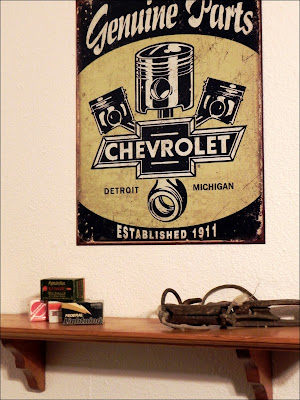 All reproduction metal signs came from Hobby Lobby, what is funny is all the other junk like oil cans, the tool tray and trunk, lantern etc is from my collection. Now...it seems as though it is acceptable to collect such material. silly boy