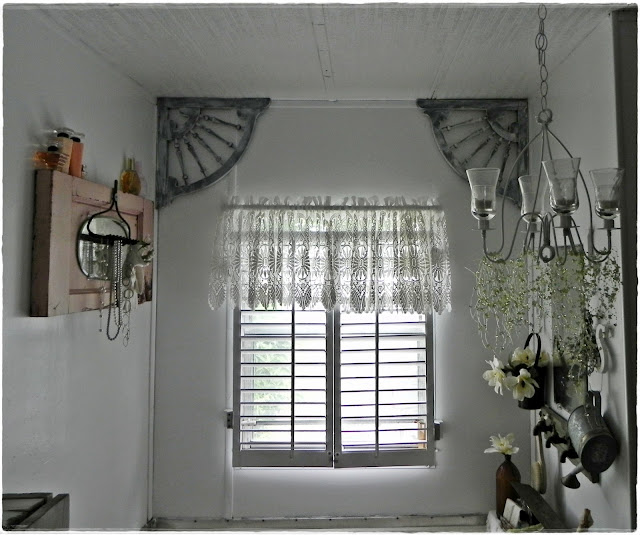 A few changes have happened since the original Vintage Bath Post. I have added some corner accent pieces, and changed the flowers on the candle light to some beads. The first photos are the natural light in the room, not the best for showing detail but I think it helps show you the relaxed feel the room has during the day.