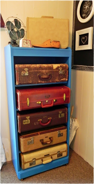 "I too share your passion for these little Traveling Treasures"...Hey, look at them as EXTRA STORAGE! I don't think you should stop buying them, THEY LOOK FANTASTIC the way you set them up. I have mine with extra linens in them. I tuck dryer sheets in the little pockets inside and it keeps everything smelling "SO GOOD"! LOVE,LOVE,LOVE the idea with the bookself! That looks WONDERFUL! Beware of that blue paint though touching the suitcases. They MAY STICK... Put a protective MAYBE napkin under each suitcase? I HAVE had that happen(we live and learn,hehe)...