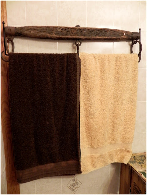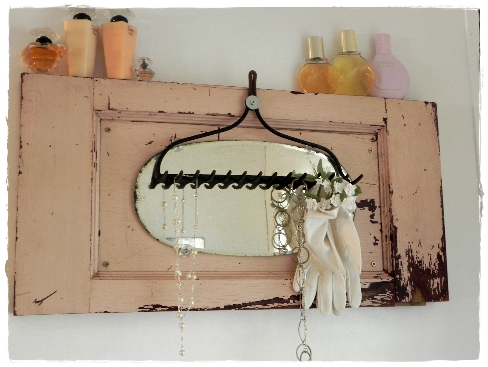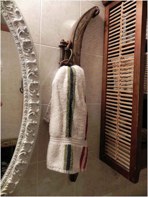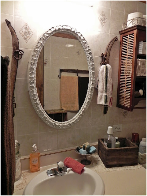 These work great as towel hangers, mixed with some crates, it has a more junk style feel. I do intend to do something with the mirror, I like the white but it is almost too white now. What do you think? I would love to find a chippy shallow wood box to mount there instead and it is on my "hope to find" list.