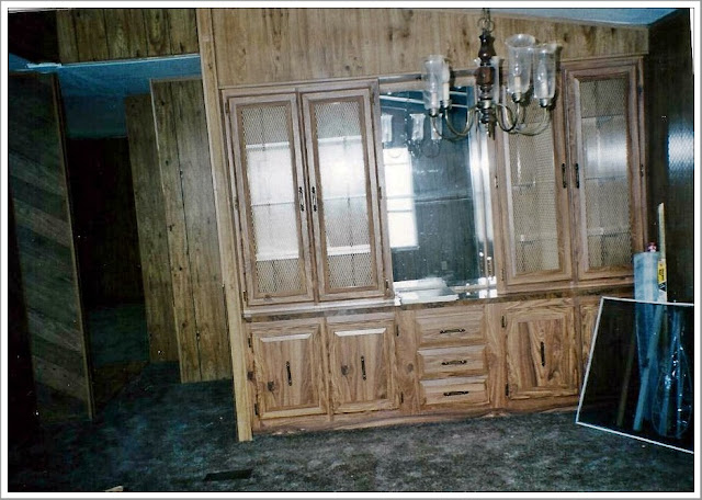 This room immediately went to an awful puke green color which didn't last long, then this brilliant dark paper with the once again great idea of stamping the moose and bear along the top. I know that I did like this back then, but it was so dark.... and hunter green.....let's say I am glad it was a passing phase.
