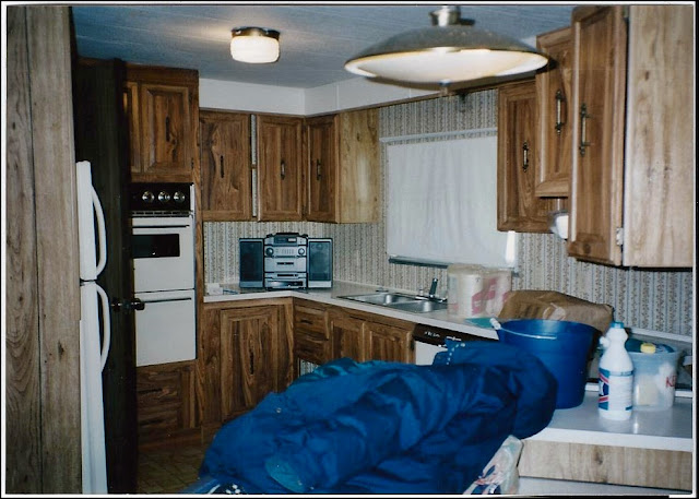 then...we went to blue, and replaced the white countertop with a deep blue swirl. (wishin the white was back) It was outdated and had two flimsy plastic yellowish sinks, one with it's own cigarette rest made from a previous owner that must have made the indent while applying his or her mascara...who knows. We went with one sink, there was really no need for two and the extra countertop space is much appreciated. All paint was directly applied over the existing fern wall board which is an almost waxy paper finish, not high gloss like so many options today.