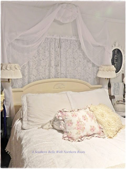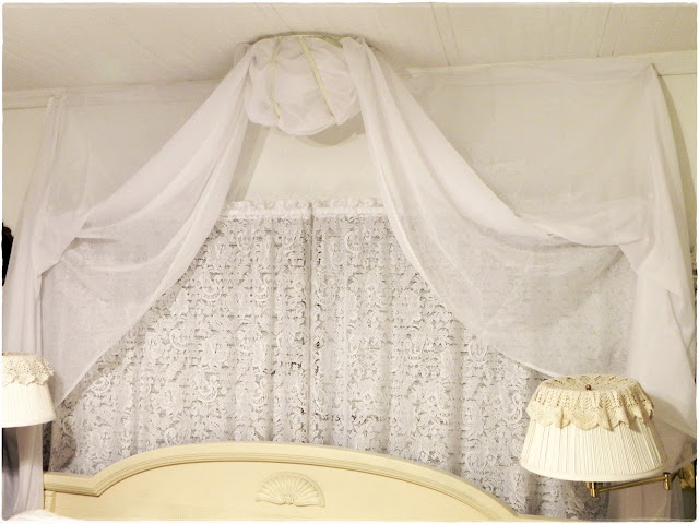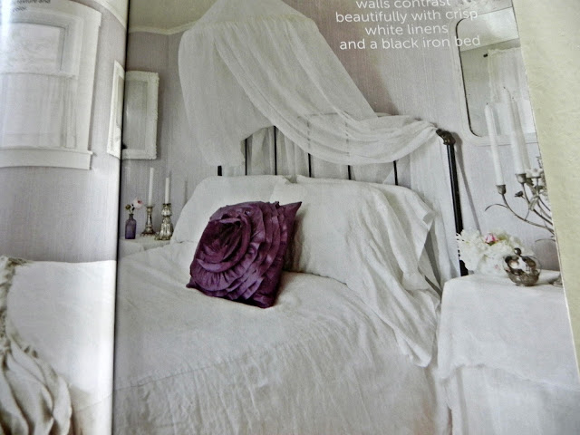 I have long dreamed of the flowing canopy above me, whisking me away to peaceful sleep. Plus it looks cool. This Romantic Country layout shows that graceful flow of sheer fabric that invites anyone for a nap! I had it all coming together except how to hang it!