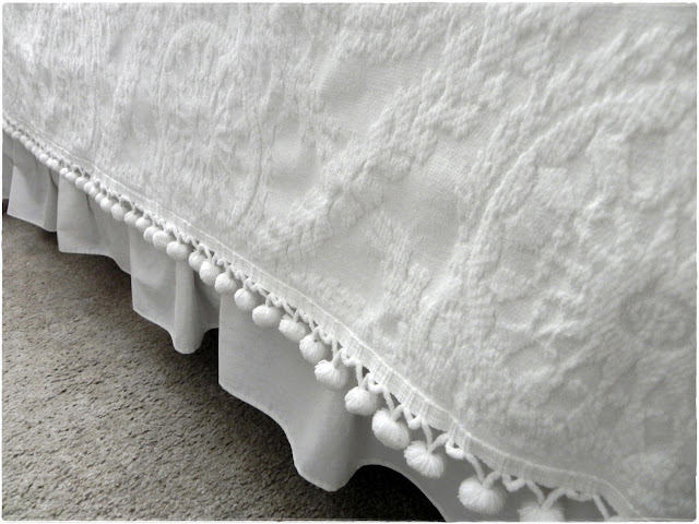 Not too long ago I did a post with my bed in it and all I could think was I need a new bedspread, a new look. Finding a spread that is big enough to really cover a Queen is a task, especially if your cheap. I like many of the new comforters but there is that something special about the older chenille or those heavy patterns, (sorry I don't know what that is called). Last weekend I came across a beauty!