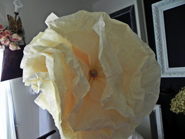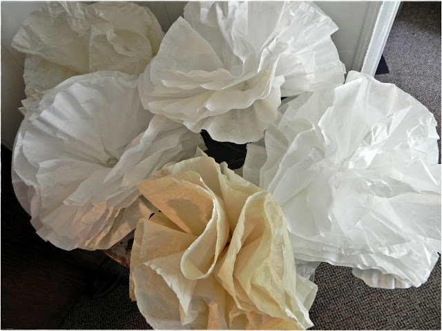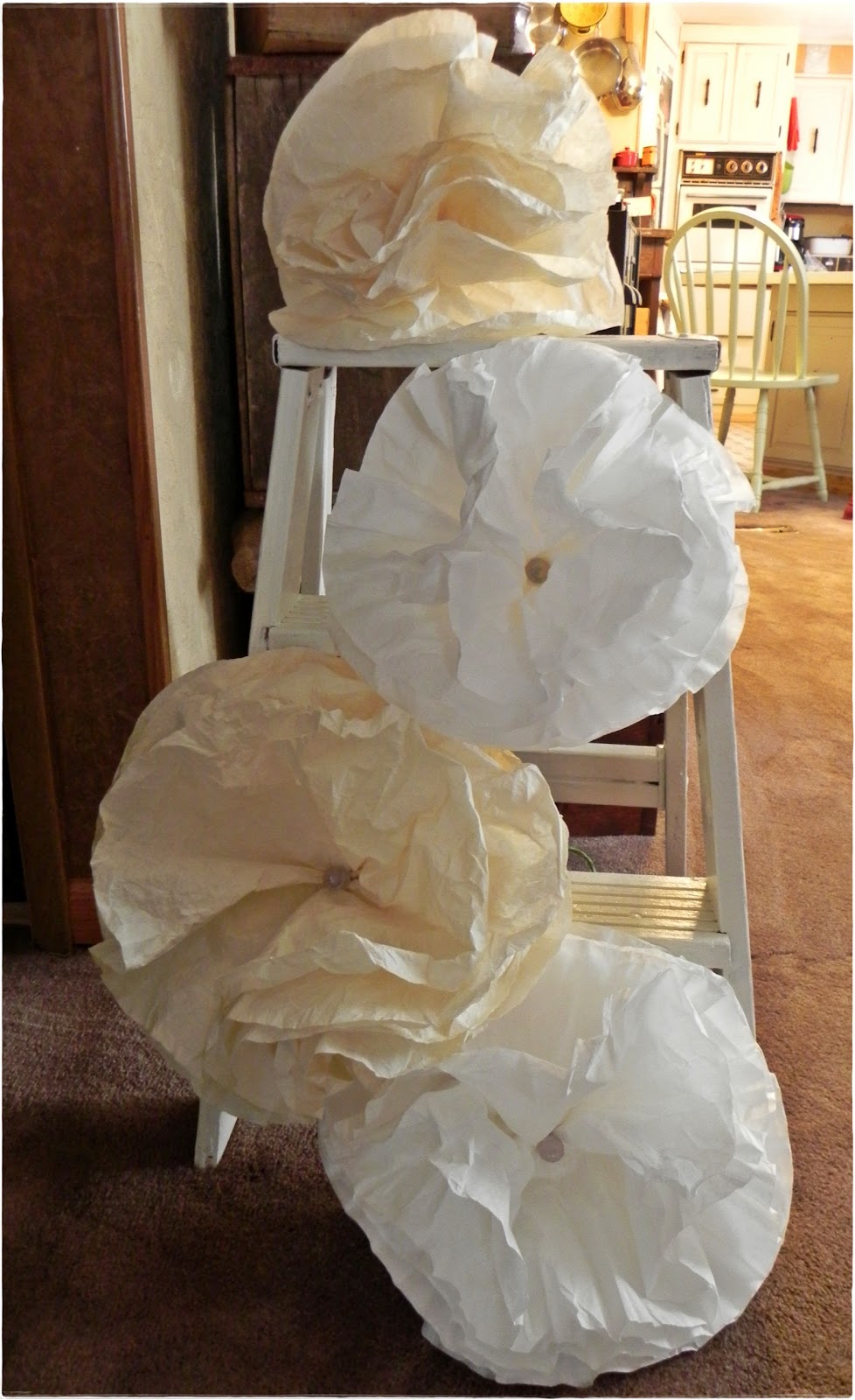 Trying out ideas for my daughter's upcoming wedding, I knew when I found ginormous commercial sized coffee filters at a garage sale, there would have to be a use! I think they will be a perfect accent for a vintage themed wedding.