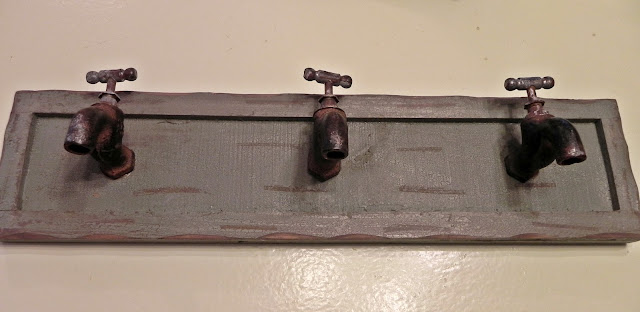 vintage bath. Faux iron faucets mounted on a ruffed up board make a cute bath or outdoor feature, maybe even a laundry room accent.