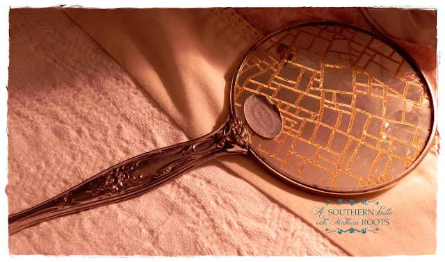 She had an antique dresser, she hung a straw flower on it and her hand mirror was often there, I don't know about you but I can't own a mirror without dropping and breaking it more than a year or two, she obviously had this one much longer.