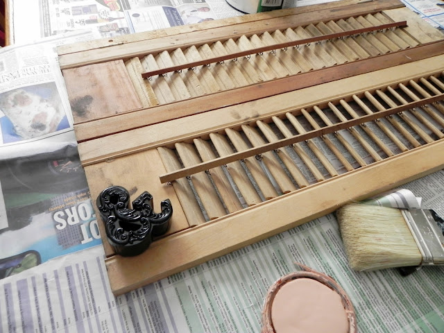 I found a shutter at a recycle store and a black ampersand at Hobby Lobby. Both got a couple coats of pink before they were ready.