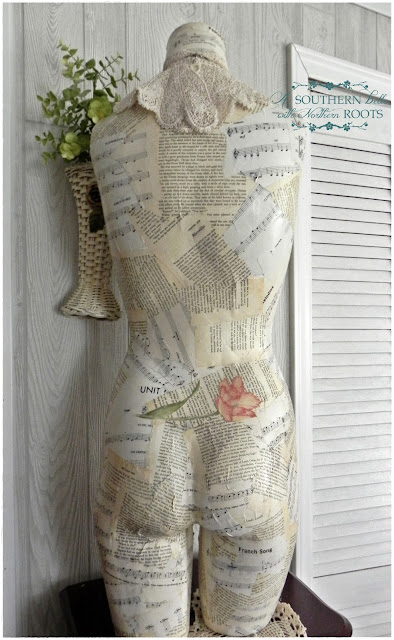 I scraped them off and set to work decoupaging her with old music and book paper.