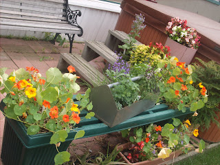 Nasturtium- Tropaeolum- also an edible flower, shown here in the ends of the bench, the yellow and orange blooms with lilly pad looking leaves